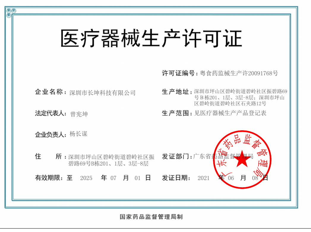 歡迎來到深圳市長坤科技有限公司官網(wǎng)! 粵深食藥監(jiān)械經(jīng)營備20151166號(hào) 粵食藥監(jiān)械生產(chǎn)許20091768號(hào)